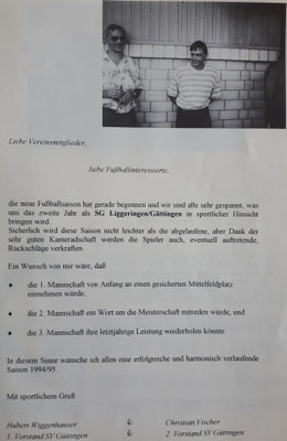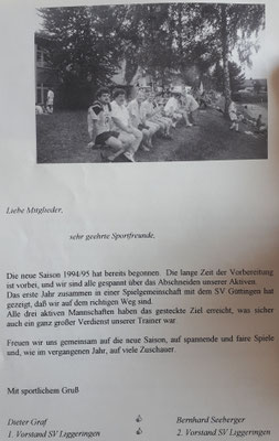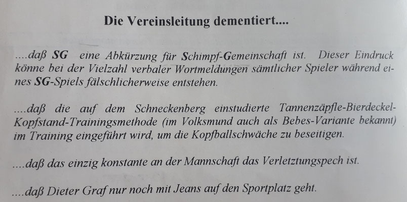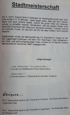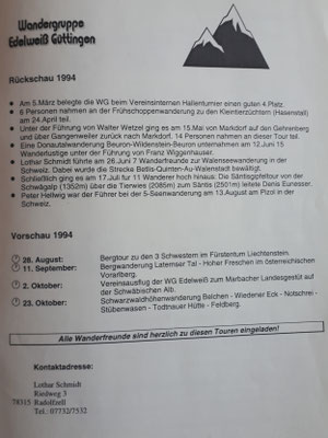 Der SV Güttingen hatte damals noch eine Untergruppe, die Wandergruppe Edelweiß. Lothar Schmidt berichtete über die durchgeführten Wanderungen und die Vorschau für das Jahr 1994. Und dann findet man noch ein paar lustige Informationen aus der SG, die sicher nicht ganz so ernst gemeint waren ;-)