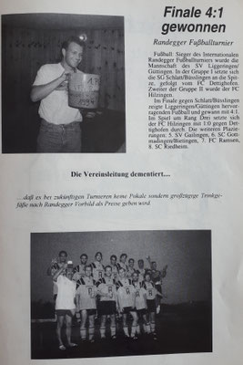 Preis ausgegeben werden sollten. Auf dem Bild sieht man den jetzigen Trainer der Ersten Mannschaft Klaus Graf mit dem «Siegespokal». Die Siegermannschaft bestand damals aus folgenden Spielern: