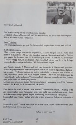 Trainer Willi Baur zog wie die Vorstände eine positive Bilanz der Saison. Als Erfolg wurde der zweite Platz bei den Stadtmeisterschaften, die es damals noch gab, in Güttingen gewertet. Der Kader